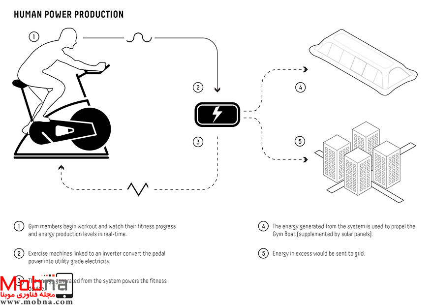موبنا – یک طراح ایتالیایی از ایده های جالب رونمایی کرده که در واقع بدنسازی روی آب و در قالب یک قایق مسطح مدرن است با این تفاوت که انرژی صرف شده برای ورزش عامل تامین نیروی مورد نیاز برای قایق است. این قایق مفهومی ۲۰ متر طول و ظرفیت جابجایی ۲۵ سرنیشین را نیز دارد.