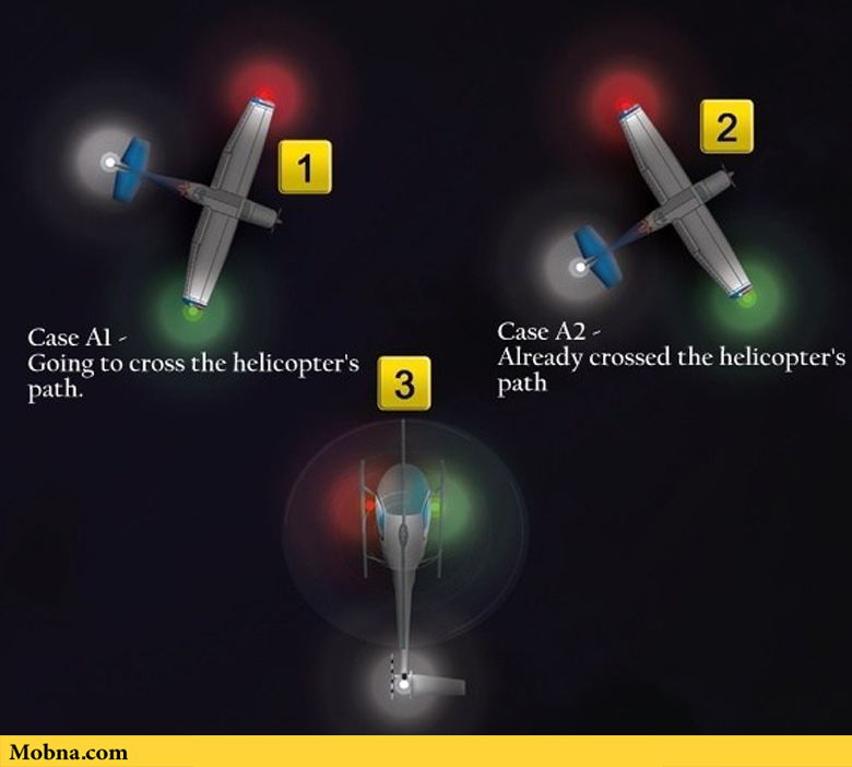 در شرایط Case A1 یک چرخبال در حال حرکت به سمت جلو است و یک هواپیما در سمت چپ آن قرار دارد. خلبان چرخبال از زاویه دید خود چراغ سبز را مشاهده میکند و این مسئله به آن معنی است که هواپیما در حال حرکت به سمت چرخبال است. این مسئله نشان میدهد که اگر هواپیما به همین شکل جلو بیاید، احتمال برخورد و تصادف وجود دارد و خلبان میبایست احتیاط کند و مسیر خود را تغییر دهد.