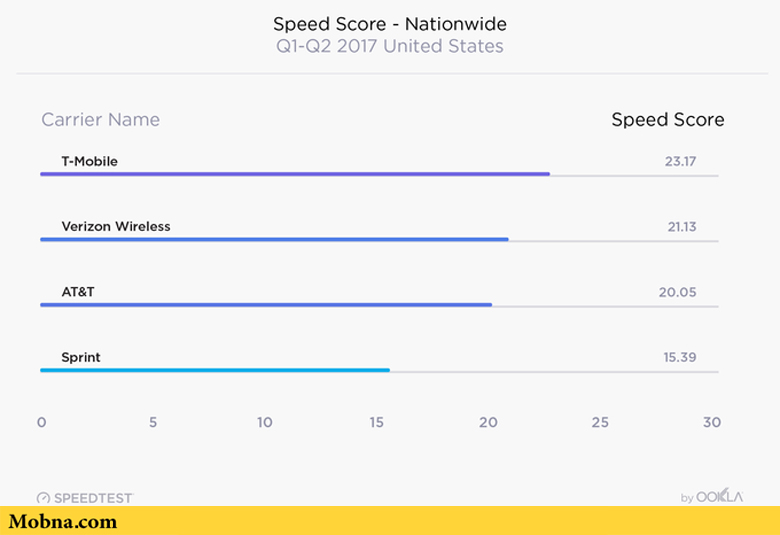 شرکت مخابراتی تی-موبایل با میانگین سرعت ۲۳.۱۷ مگابیت در ثانیه بیشترین سرعت دانلود را در اختیار کاربران موبایلی قرار داد.