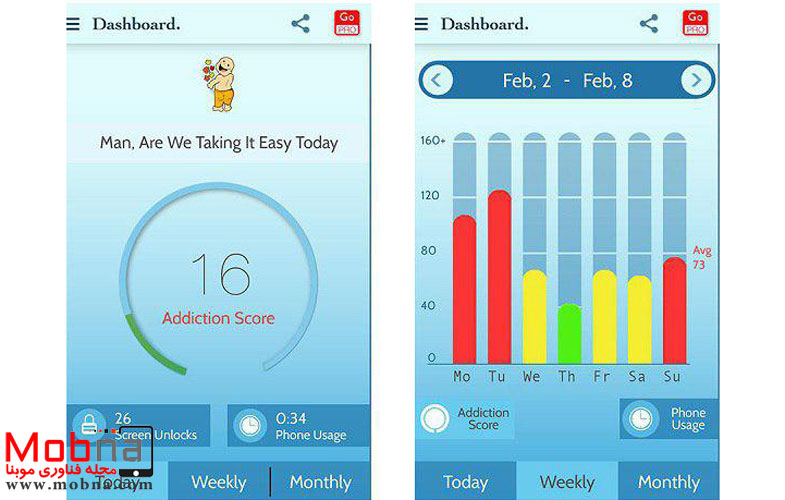 همانند سایر برنامه هایی که پیش تر معرفی شد، این اپ نیز مقدار استفاده شما از اینترنت و برنامه های وابسته به آن را بررسی می کند. اما تفاوتی مهم میان آن با دیگر اپ ها دیده می شود و آن نیز تبدیل داده های به دست آمده به “امتیاز وابستگی” خواهد بود! از این طریق می توانید سطح اعتیاد خود به اینترنت و فضای مجازی را بسنجید. از طرفی تعداد دفعاتی که قفل صفحه گوشی هوشمند خود را باز می کنید نیز نشان داده می شود. بر اساس این داده میزان مصرف روزانه مشخص خواهد شد. به کمک برخی از امکانات موجود در این برنامه می توانید نوتیفیکیشن های دریافتی و یا تماس های تلفنی را نیز محدود کنید. BreakFree برای سیستم عامل های اندروید و آی او اس قابل دانلود است.