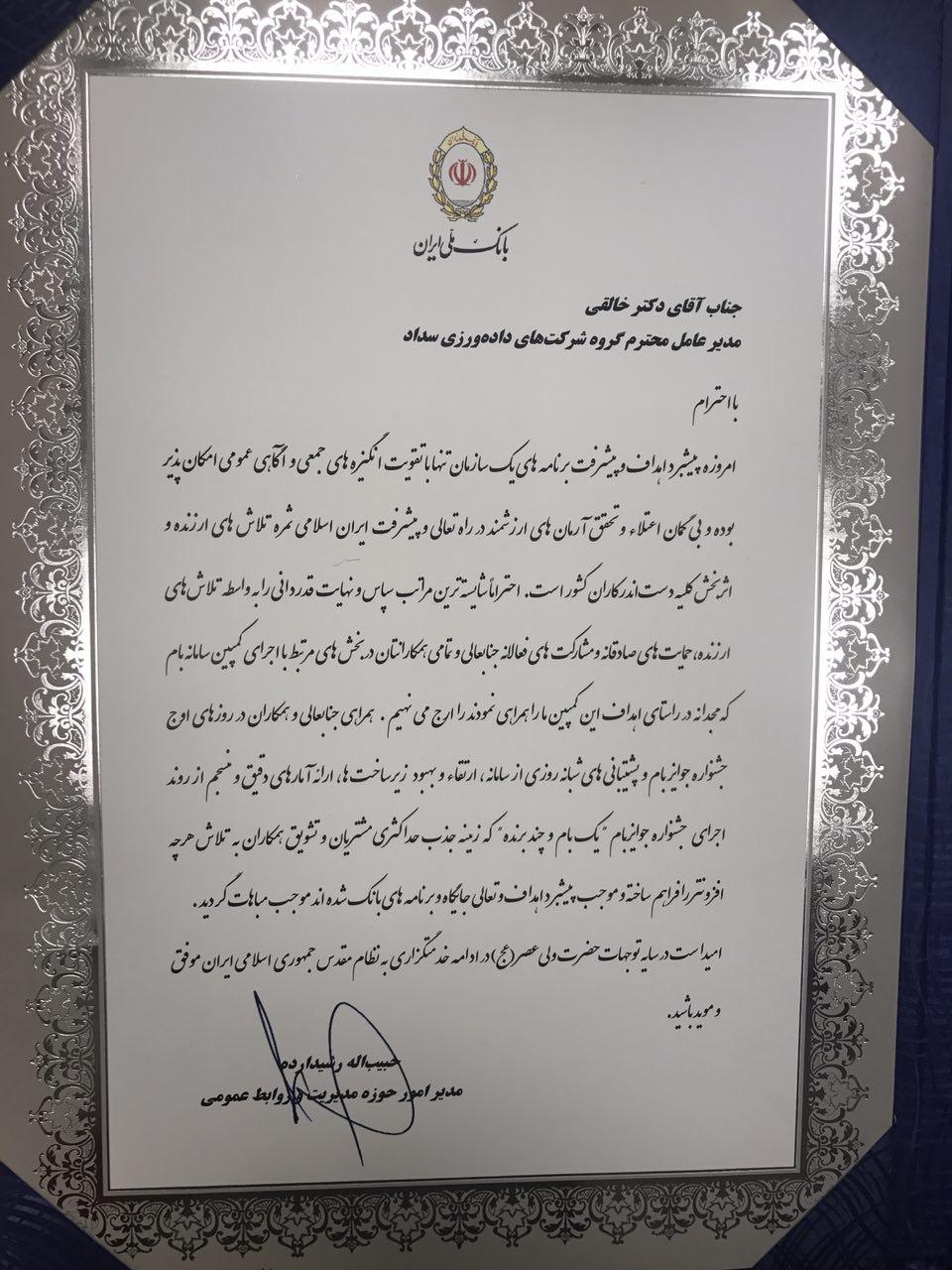 در پی اجرای موفق دومین کمپین جشنواره جوایز سامانه بام و به دنبال پشتیبانی های شبانه روزی و مجدّانه شرکت داده ورزی سداد از سامانه یاد شده، مدیر امور حوزه مدیریت و روابط عمومی بانک ملّی ایران ، به نیابت از دکتر محمدرضا حسین زاده مدیرعامل بانک ملّی ایران، لوح تقدیر و سپاسی را خطاب به فرامرز خالقی، مدیرعامل گروه شرکت های داده ورزی سداد اعطا کرد.