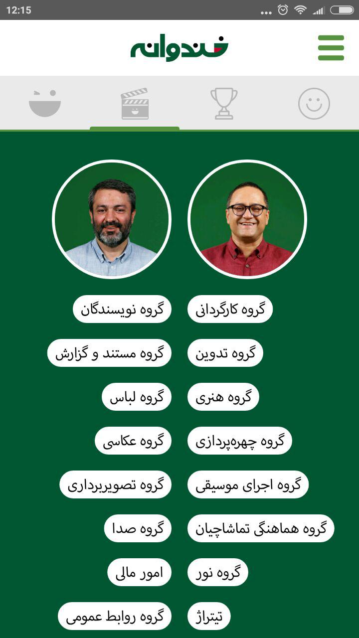 در این بخش اعضای گروه خندوانه معرفی میشود که شما با تاچ کردن هر قسمت میتوانید جزئیاتی از آنها بدست بیاورید.