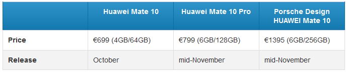 Mate 10 پرو نیز با ۶ گیگ رم و ۱۲۸ گیگابایت فضای ذخیرهسازی ۷۹۹ یورو قیمتگذاری شده است و از اواسط نوامبر در دسترس قرار خواهد گرفت. در نهایت مدل خاص پورشه که هم در طراحی و هم در مشخصات متفاوت است، از اواسط نوامبر و با قیمت ۱۳۹۵ یورو عرضه خواهد شد.