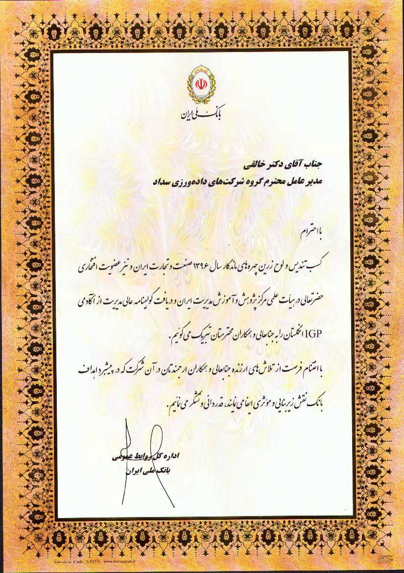 کسب تندیس و لوح زرین چهره های ماندگار سال ۱۳۹۶ صنعت و تجارت ایران و نیز عضویت افتخاری حضرت عالی در هیأت علمی مرکز پژوهش و آموزش مدیریت ایران و دریافت گواهینامه عالی مدیریت از آکادمی IGP انگلستان را به جناب عالی و همکاران محترمتان، تبریک گفته و با اغتنام فرصت از تلاش های ارزنده جناب عالی و همکاران ارجمندتان در آن شرکت که در پیشبرد اهداف بانک نقش زیر بنایی و مؤثری ایفا می نمایند؛ قدردانی و تشکر می نمائیم.