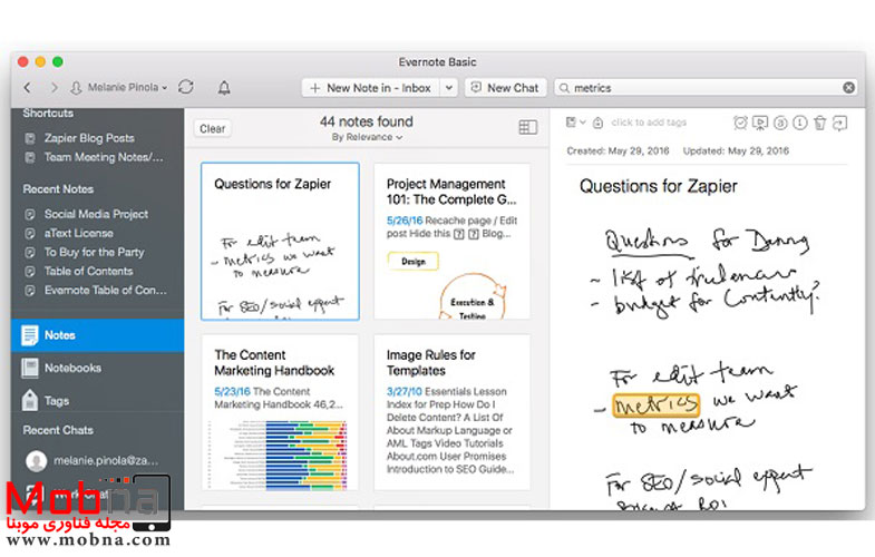 نام Evernote در شمار قدرتمند ترین اپ های یادداشت برداری دیده می شود. استفاده از این برنامه رایگان است اما برای دسترسی به تمامی امکانات آن، پرداخت ۳۴.۹۹ دلار سالانه ضروری خواهد بود. مهم ترین مزیت این اپ به عقیده اکثر کاربران، پشتیبانی همزمان از برنامه در چندین پلت فرم مختلف است. به عنوان مثال اگر گوشی هوشمند خود را فراموش کرده باشید، می توانید برنامه را دقیقا با همان فایل هایی که ذخیره کرده اید روی لپ تاپ خود باز کنید.