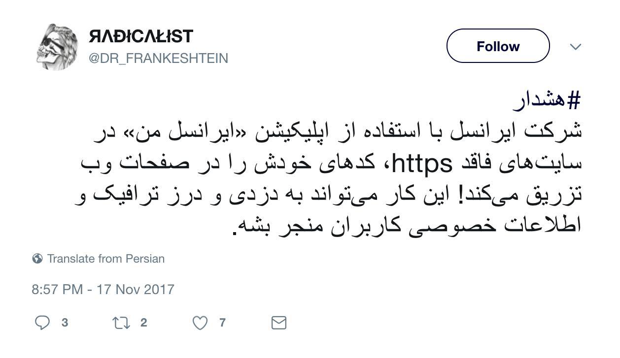 در پاسخ به نگرانیهای مطرح شده از سوی برخی کاربران محترم، ذکر این نکته لازم است که در فرایند فوق، هیچگونه رصد و مانیتورینگ فعالیت کاربران در شبکه صورت نمیگیرد و بدون هرگونه ارتباط با فعال بودن نرمافزار «ایرانسل من» روی گوشی مشترک، صرفا از طریق مسیریابی عادی شبکه و مبتنی بر نشانی IP وبسایت مقصد، در مورد برخی وبسایتهای پربازدید داخلی که از پروتکل HTTP پشتیبانی میکنند، نوار ابزار در دسترس کاربران قرار میگیرد.