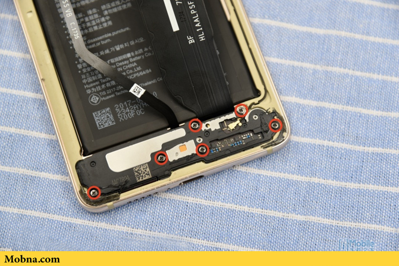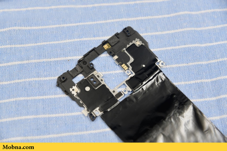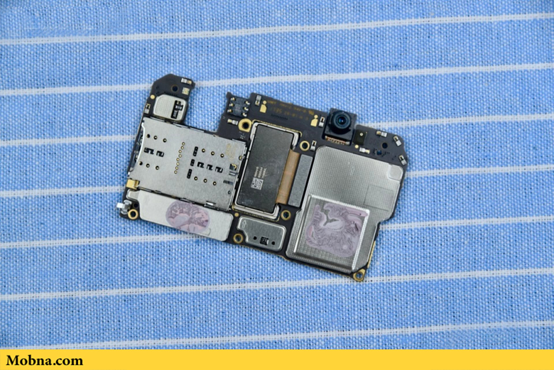 مادربرد دستگاه با قسمتهای پایینی بدنه یعنی پورت USB-C، اسپیکرها و … در ارتباط است و این اتصال از طریق روبانهای الکترونیکی صورت گرفته است تا باتری به مادربرد متصل شود. بناربراین زمانی که قصد دارید بخش پشت بدنه این دو دستگاه را از آن جدا کنید باید بسیار احتیاط کنید. زیرا هر گونه آسیب به روبان الکترونیکی میتواند ارتباط همه بخشها را از هم جدا کند.