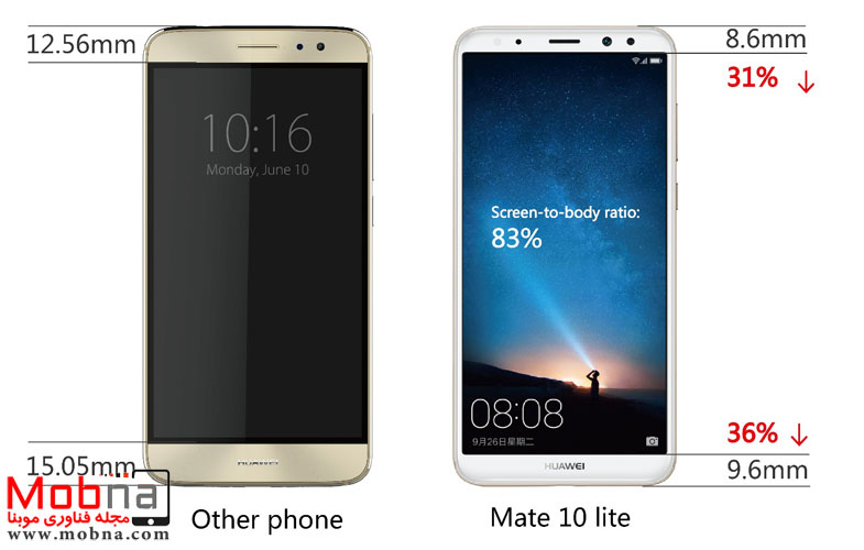 حاشیه بالایی Mate 10 lite در مقایسه با گوشی قبلی خود ۳۱ درصد و حاشیه پایین هم ۳۶ درصد باریک تر شده است. این به این معناست که HUAWEI Mate 10 lite از یک مانیتور ۵.۹ اینچی در اندازه گوشی معادل یک گوشی با مانیتور ۵.۵ اینچی بهره می برد.