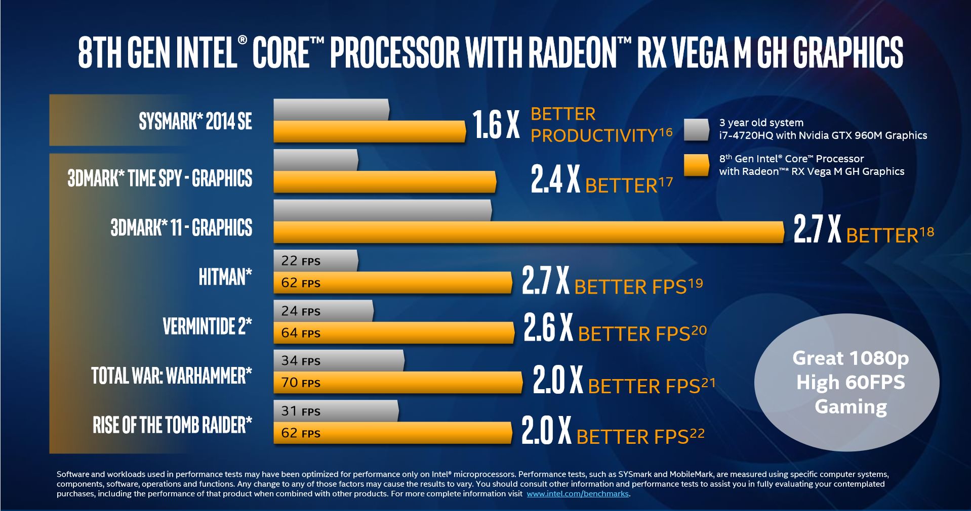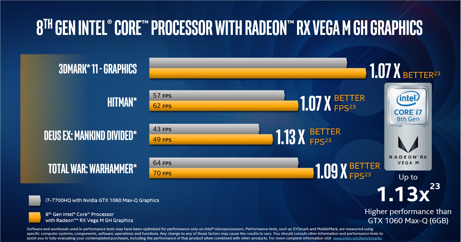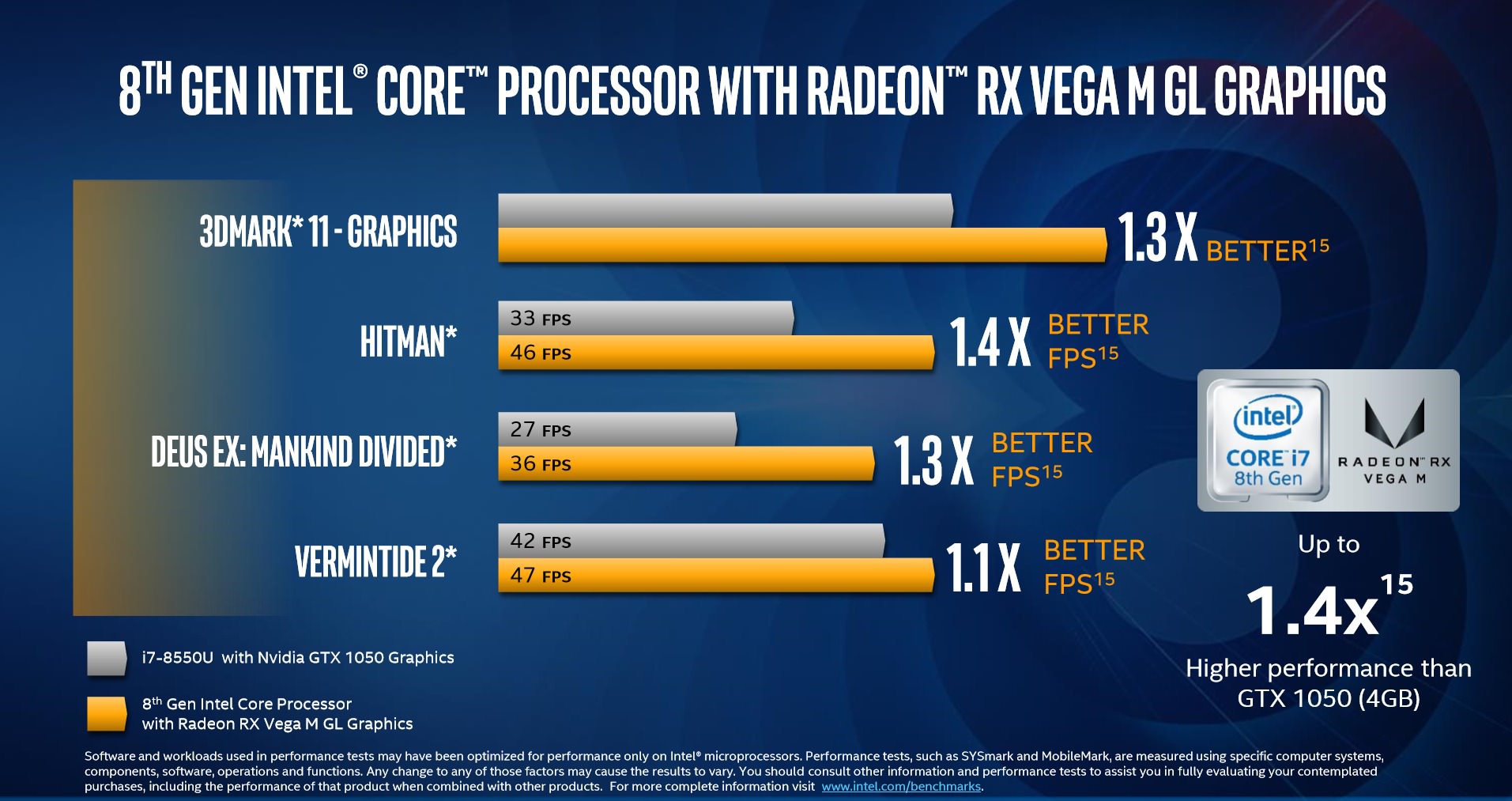 طبق ادعای اینتل ،در لپتاپها ماژول RX Vega M GL و در بازی Hitman، کاربران ۱.۴ برابر سرعت بیشتری نسبت به پردازندهی گرافیکی قدرتمند GTX 1050 انویدیا تجربه خواهند کرد که در نوع خود خارقالعاده است. نمونهی قدرتمندتر GH پردازندهی گرافیکی وگا نیز در دسکتاپها ۱۰ درصد عملکرد بهتری نسبت به پردازندهی محبوب GTX 1060 Max-Q انویدیا در کنار پردازندهی اصلی Core i7-7700HQ خواهد داشت. این موضوع بدین معنی است که با پردازندهی مشترک اینتل و AMD در عموم بازیهای روز و در رزولوشن ۱۰۸۰P به نرخ ۶۰ فریم بر ثانیه دست خواهید یافت. این ارقام برای پردازندهی یکپارچه حقیقتا فوقالعاده است. اینتل در پاسخ سوال خبرنگاران مبنی بر استفاده از هستههای وگا در این واحد پردازشی، اعلام کرد که این هستهها به صورت سفارشی توسط AMD برای اینتل توسعه یافتهاند و البته شباهت زیادی به نمونههای RX Vega مورد استفاده در دسکتاپها دارند.