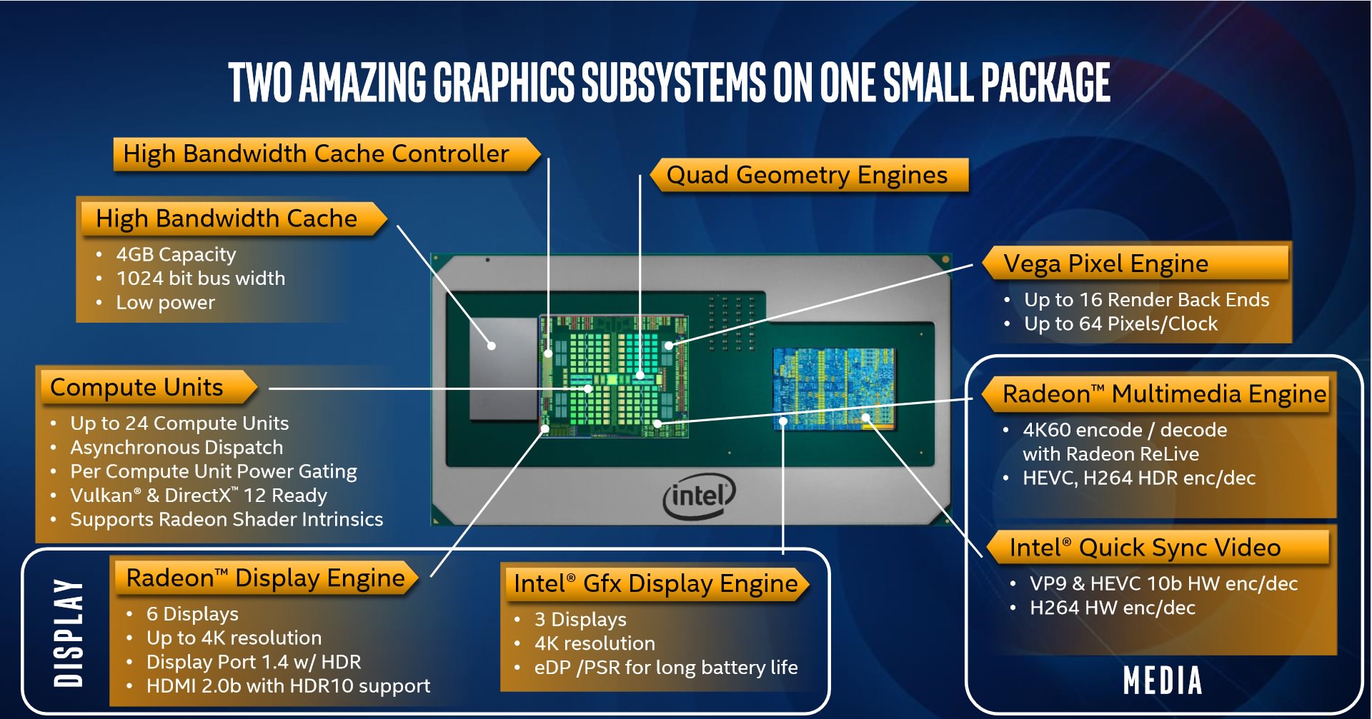 اینتل برای بهره بردن از قدرت بالای پردازشی AMD، چیپ جدیدی توسعه داده است؛ این چیپ عریض اکنون توانایی حمل هستههای پردازشی AMD و اینتل را دارد. البته بخش حافظهی فوقسریع HBM2 نیز در کنار واحد پردازشی وگا نیز روی این چیپ به چشم میخورد. اما چالش اصلی اینتل برای توسعهی این چیپ جدید، توسعهی باند ارتباطی جدید و سریعی است که امکان ارتباط لحظهای حجم گستردهی دادههای ماژولهای حافظه و پردازندهی گرافیکی وگا را محیا کند. EMIB (Embedded Multi-Die Interconnected Bridge) وظیفهی این امر را برعهده گرفته است و به گفتهی اینتل پهنای باند بالای آن گلوگاهی برای وگا ایجاد نخواهد کرد. هشت لین نسل سوم PCI Express نیز وظیفهی اتصال پردازندهی اصلی و گرافیکی را برعهده دارد.