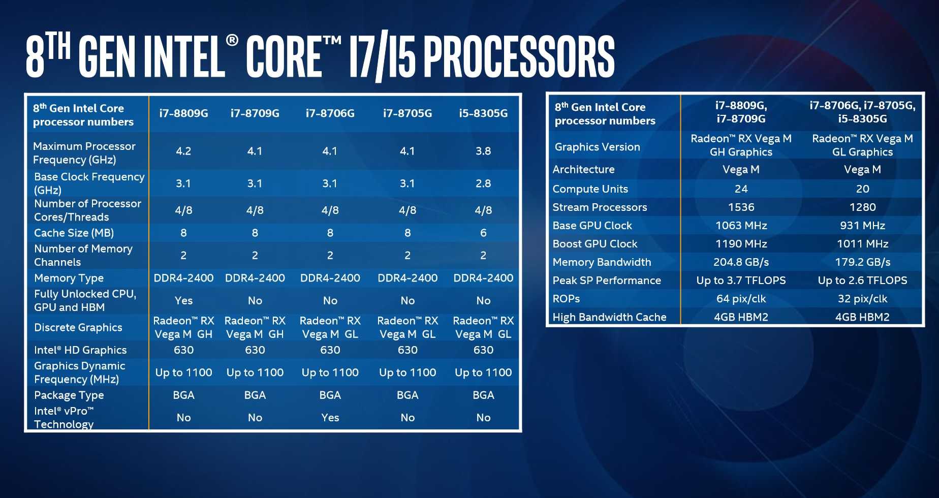 اینتل در حال حاضر دو نسخه از پردازندهی خود را با واحد گرافیکی متفاوت AMD عرضه میکند. نمونهی اول که نام RX Vega M GL را به یدک میکشد، برای لپتاپها و دستگاههای قابل حمل توسعه یافته است. اما نمونهی دیگر که کد GH را در انتهای نام واحد گرافیکی خود میبیند، برای دسکتاپها و محصولات قدرتمندتر توسعه یافته است. نمونهی GL در سرعت کاری پایینتر ۹۳۱ و ۱۰۱۱ مگاهرتز فعالیت میکند و از ۲۰ واحد پردازشی بهره میبرد. این واحد گرافیکی با پردازندههای نسل هشتم Core i5 یا Core i7 همراه خواهد شد. این در حالی است که مدل GH به ۲۶ واحد پردازشی با سرعت کاری ۱٬۰۶۳ و ۱٬۱۹۰ مگاهرتز مجهز است و تنها پردازندهی i7 نسل هشتم اینتل را در کنار خود میبیند. برای مقایسه بد نیست بدانید که پردازندهی موبایل APU شرکت AMD در قدرتمندترین مدل خود از ۱۰ واحد پردازشی در بخش گرافیکی خود بهره میبرد.