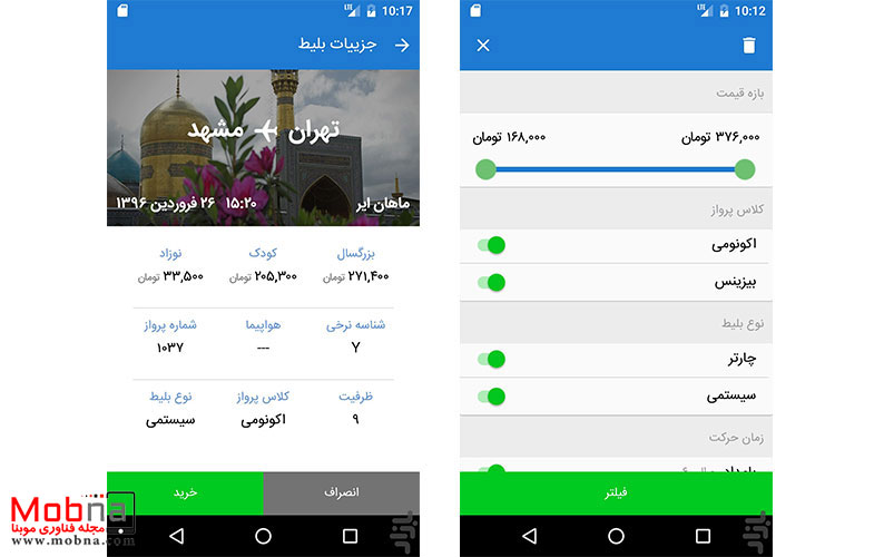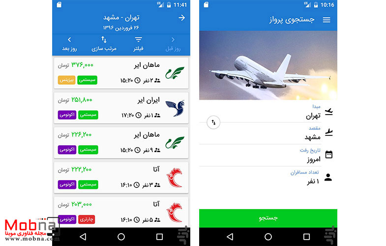 گام نخست در روند خرید، تکمیل فیلدهای مربوط به مبدا، مقصد، تاریخ سفر و تعداد مسافران و جستجوی بلیط هواپیما مورد نظر کاربر است. فهرست نمایش داده شده، لیستی از تمامی بلیط های هواپیما موجود است که قابلیت مرتب سازی بر اساس زمان، قیمت و ظرفیت مسافران را داراست. علاوه بر اینها، پنج فیلتر تعبیه شده در نرم افزار ( بازه قیمت، کلاس پرواز، نوع بلیط، زمان حرکت و شرکت هواپیمایی مانند بلیط هواپیما ایران ایر)، شما را در انتخاب بلیط هواپیمای متناسب با بودجه، سلیقه و شرایط سفرتان، یاری خواهند نمود به این ترتیب می توانید پس از مقایسه بلیط های موجود، بلیط هواپیما مورد نظر خود را انتخاب نمایید.