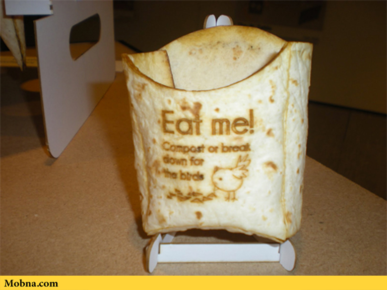 با این وجود یکی از دانشجویان دانشگاه هنرهای زیبا در بریتانیا به نام «روبرت گوردون» ظرف ویژهای برای بستهبندی غذاهای آماده ارایه کرده است که به راحتی میتوان آن را خورد. این ظرف از جنس نان تورتیلا ساخته شده است. طراحی این ظرف به گونهای است که برای قرار دادن سیب زمینی سرخ شده در آن بسیار مناسب است و البته دیگر غذاهای آماده کوچک هم میتوانند به راحتی داخل آن ریخته شوند.