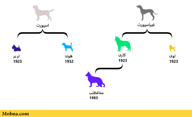 باشگاه آمریکایی کِنِل (AKC) به عنوان نهاد ثبت نژادهای اصیل سگ در آمریکا از مدتها قبل ثبت رسمی این حیوان را آغاز کرد و به موجب آن تمام نژادهای سگها به دو دسته اسپورت و غیراسپورت تقسیم بندی شد. یکی از مهمترین مشخصههای جدا کردن سگها در این دو دسته اندازه بدن آنها بود. با این وجود به دلیل گوناگونی در تعداد و نژاد سگها، به مرور زمان گروههای جدید هم برای تشخیص بهتر این حیوان روی کار آمد تا نمونههای مشابهتری در کنار یکدیگر قرار بگیرند. این تقسیمبندی جدید موجب شد «تریِر» و «هوند» از گروه سگهای اسپورت جدا شدند و طولی نکشید که در خانواده سگهای غیراسپورت دو گروه جدید «کاری» و «توی» هم مشخص شد. سرانجام گروه «محافظت» از گروه سگهای «کاری» خارج شد تا مرکز AKC برای تقسیمبندی نژاد سگها به عدد هفت برسد و تمامی سگها را در هفت گروه اصلی جدا کند.