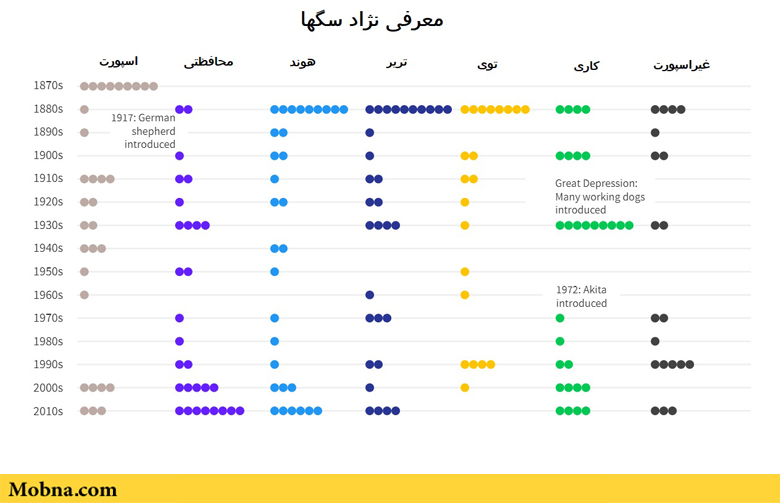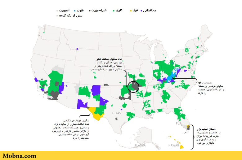 نقشه کشور آمریکا که در اینجا منتشر شده است نشان میدهد کدام یک از گروههای سگها بر اساس نژاد و کد مربوطه در پایگاه داده AKC بیشتر ثبت شدهاند. با بررسی این نقشه میتوان دریافت گروه سگهای اسپورت بیشترین تعداد سگها را در خود جا دادهاند و به صورت باورنکردنی در بین آنها نژادهای «لابرادور» و «گلدن رِتریور» بسیار محبوب هستند. در این نقشه میزان پراکندگی نژادهای مختلف سگها بین مردم آمریکا نشان داده شده است و با این توضیح میتوان دریافت که این گونه از سگها چقدر توانستهاند در جامعه مدرن و خانوادههای امروزی آمریکا جای خود را باز کنند.