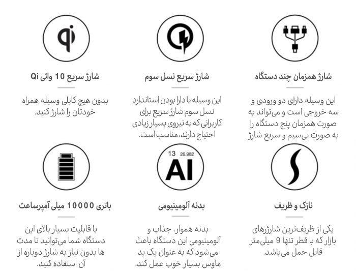 ویژگیهای PowerDock عبارتند از شارژ سریع بیسیم ۱۰ واتی، سازگاری با استاندارد شارژ سریع نسل سوم، توانایی شارژ پنج دستگاه به طور همزمان و باتری بزرگ ۱۰۰۰۰ میلی آمپر ساعت . این وسیله یک محیط کار کارآمد برای شما ایجاد میکند! PowerDock هوشمندانه طراحی شده است تا با قابلیت بسیار خود نگرانی در مورد طول عمر باتری و میز کار شلوغ را از بین ببرد.