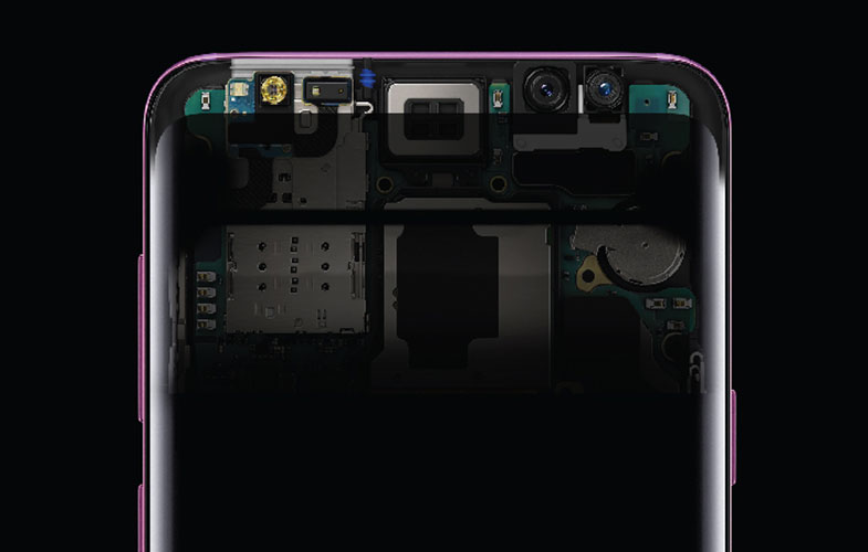 ما برای اینکه بتوانیم یک تجربه صوتی سه بعدی را در گوشیهای گلکسی S9 و S9+ ایجاد کنیم، تصمیم گرفتیم یک بلندگوی دینامیکی دیگر را هم داخل گوشی جا بدهیم. بالای گوشی بهترین جا بود چرا که امکان پخش صدای استریو را فراهم میکرد. اما معنی این کار آن بود که باید اجزای داخلی گوشی مانند دوربین جلو و اسکنر عنبیه چشم را جابجا میکردیم تا جا برای بلندگو باز شود. مهمتر اینکه باید بلندگویی طراحی کنیم که در عین قدرتمند بودن به اندازه کافی باریک باشد تا مزاحم نمایشگر بدون مرز (Infinity Display) گوشی نشود.