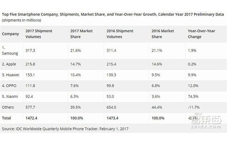 در حالی که بازار اشباع شده و رشد منفی را تجربه میکند، سهم سامسونگ و اپل در حال کاهش است. بر اساس رتبهبندی موسسه جهانی IDC در ماه فوریه، سهم بازار هواوی از ۹.۵% در سال ۲۰۱۶ به ۱۰.۴% در سال ۲۰۱۷ رسیده است. هم در تعداد و هم در سود ناخالص رشد قابل توجهی را نشان میدهد.