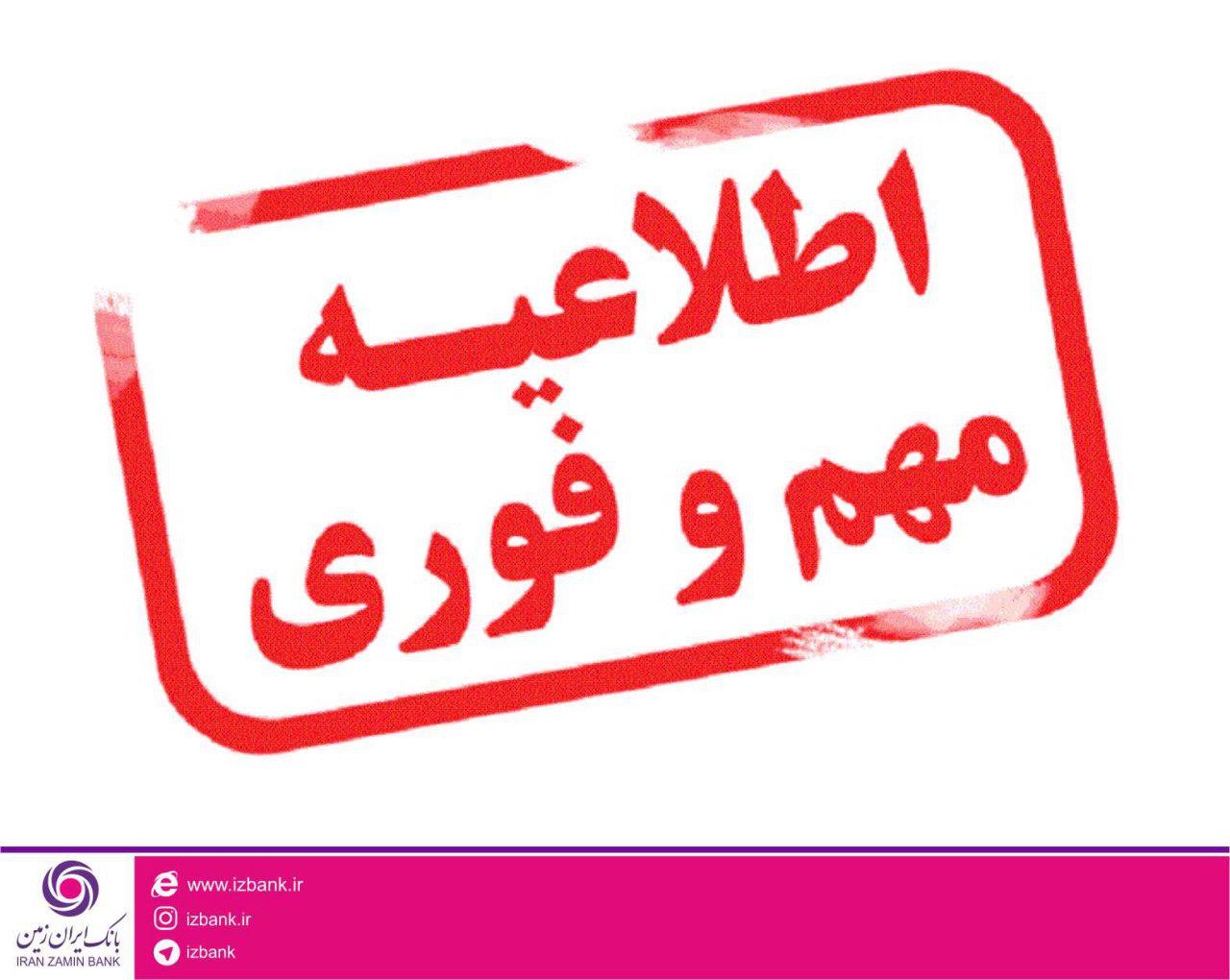 روابط عمومی بانک ایران زمین ضمن عذرخواهی از کلیه مشتریان گرامی بانک ایران زمین، تقاضا می کند که برای انجام خدمات بانکی موردنیاز خود قبل و یا بعد از ساعت های اعلامی اقدام نمایند.
