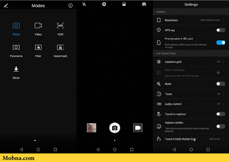 شما همچنین میتوانید بر اساس این رابط کاربری صفحه اصلی مربوطه را به سمت راست یا چپ بکشید تا امکانات بیشتر در اختیار شما قرار گیرد. با این اتفاق اگر صفحه را از سمت چپ به راست بکشید حالتهای بیشتر از جمله عکاسی، فیلمبرداری، HDR، پانوراما، فیلتر، واترمارک و … نمایان میشوند و در عوض، کشیدن صفحه از سمت چپ به راست باعث میشود امکانات دیگر از جمله تنظیمات کلی دوربین را در اختیار داشته باشید.