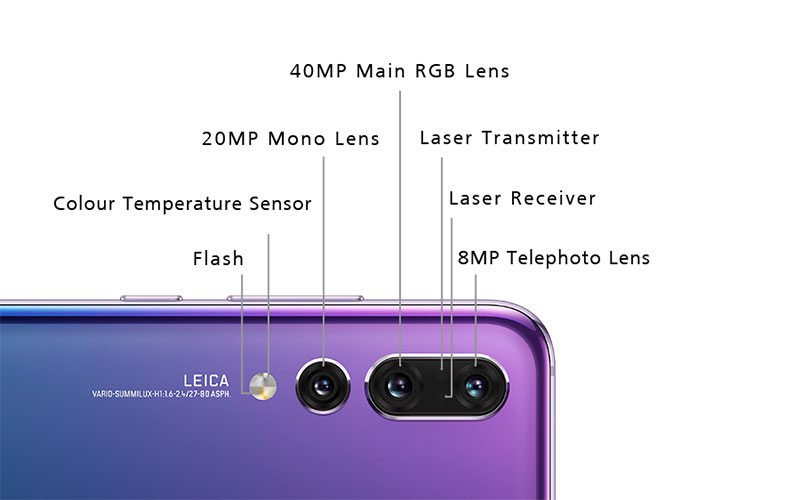 با تکیه بر سرمایهگذاری روی همکاری بلندمدت با Leica، هواوی موفق شده HUAWEI P20 Pro را به ترکیب سه دوربینه از طرف لایکا، با بیشترین تعداد مجموع پیکسلی که در گوشیهای هوشمند مدرن شاهد هستیم، مجهز کند. سیستم دوربین این گوشی هوشمند از یک سنسور RGB (رنگی) با رزولوشن ۴۰ مگاپیکسل، یک سنسور تک رنگ (سیاه و سفید) با رزولوشن ۲۰ مگاپیکسل و یک سنسور ۸ مگاپیکسلی با لنز تلهفوتو (برای تشخیص و استفاده از عمق میدان) تشکیل شده تا تصاویری را با نور بیشتر و جزئیات ممتاز ایجاد کند.