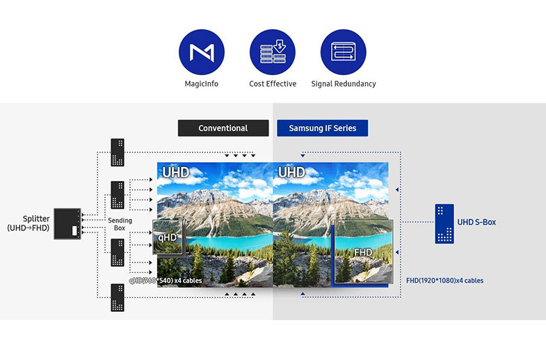 در این میان سری IF این نمایشگرها به گونهای طراحی شده که در محیطهای داخلی مانند پاساژها، ساختمانهای تجاری و اداری و… بهترین تجربه بصری ممکن را ارائه دهد. مدل IF020H نمایشگرهای الایدی ساینیج سامسونگ با قابلیتهایی همچون پشتیبانی از فناوری HDR، کالیبراسیون رنگ پیشرفته، نمایش دقیق رنگها، بدنه مقاوم در برابر تغییرات آبوهوایی، کاهش هزینه خرید و نصب تجهیزات جانبی، مصرف پایین انرژی و… به راهکاری حرفهای و کارآمد برای صاحبان کسبوکارها تبدیل شده است.