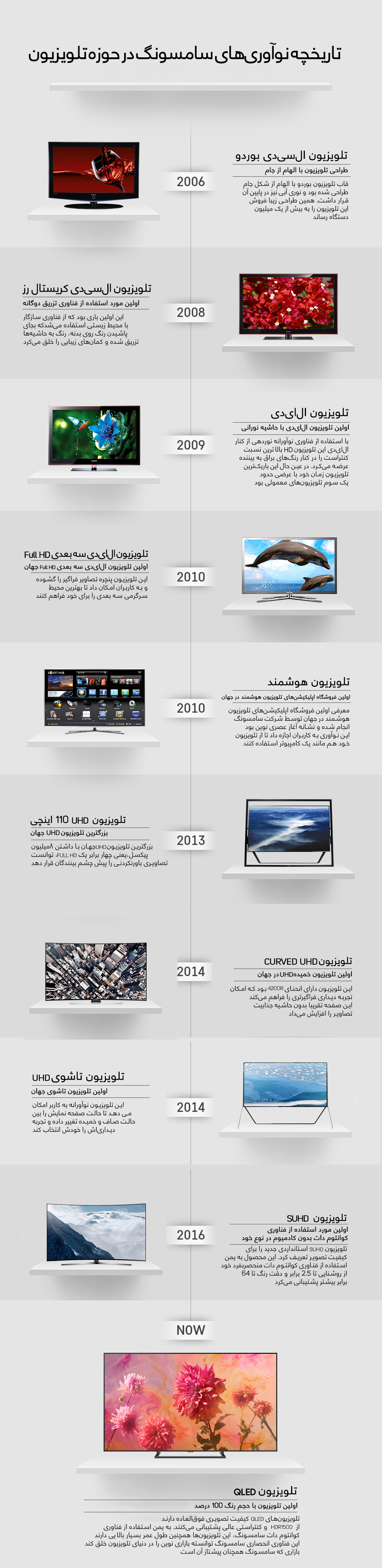 در ۱۲ سال گذشته همواره شرکت سامسونگ برترین تولیدکننده تلویزیون در جهان بوده است. در این مدت استانداردهای تلویزیون در زمینه طراحی، رنگ، دقت و کیفیت تصویر بصورت چشمگیری ارتقا پیدا کرده و بینندگان میتوانند تجربهای فراگیرتر و لذتبخشتر داشته باشند.