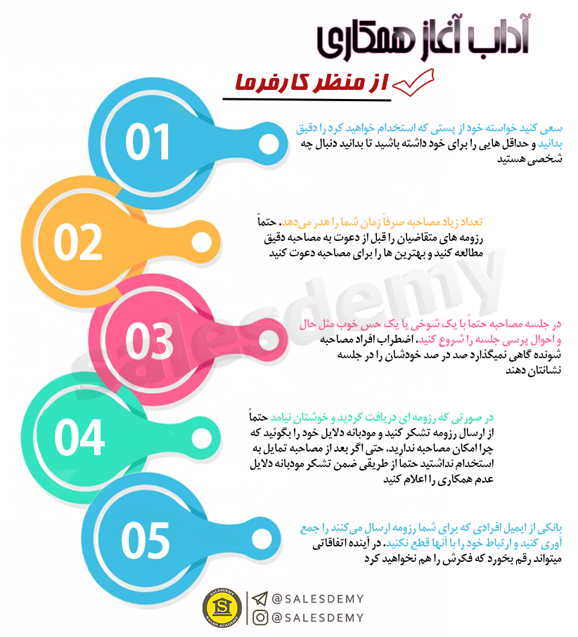 خُب، تا اینجا با اقداماتی که مدیر کسب و کار در طول فرایند جذب نیروی جدید بایستی انجام دهد آشنا شدید. حال لازم است که بدانید از طرف شخص جویای کار نیز لازم است که برخی نکته رعایت گردد.