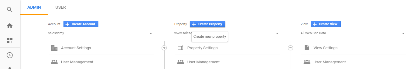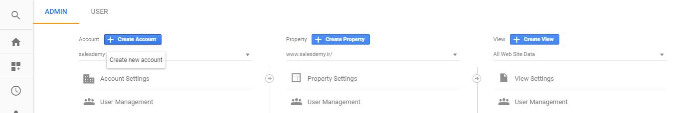 به همین ترتیب، اگر شما می خواهید وب سایت جدیدی را تحت اکانت گوگل آنالیتیک اضافه کنید، با رفتن به قسمت منوی ادمین و با کلیک بر روی منوی کشویی ستون اموال و یا وبسایت این امکان را خواهید داشت. در این منو با کلیک بر روی ” ایجاد لینک جدید برای اموال و یا وبسایت ” این امکان برای شما فراهم خواهد شد.