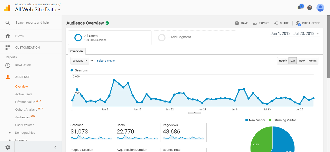 زمانی که جمع آوری داده را در گوگل آنالیتیک شروع کردید می توانید اطلاعاتی را از ترافیک وب سایت خود بدست آورده و یاد بگیرید. هر زمانی که وارد حساب گوگل آنالیتیک خود شوید می توانید گزارش تعداد مشاهده کنندگان را داشته باشید و ببینید. همین طور، اگر شما بیش از یک وب سایت دارید، می توانید به لیست وب سایت انتخابی خود بروید و فرم مورد نظر را مشاهده کنید، و گزارش تعداد مشاهده کنندگان آن وب سایت را ببینید. این لیست یکی از ۵۰ لیستی است که گوگل آنالیتیک می تواند به شما ارائه کند. هم چنین با کلیک بر روی لینک گزارش در بالای صفحه نیز می توانید به این اطلاعات دست یابید.
