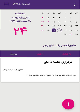 - قابلیت درج رویداد(جلسات یا تولد) با قابلیت شروع و پایان و یادآوری برای هر روز