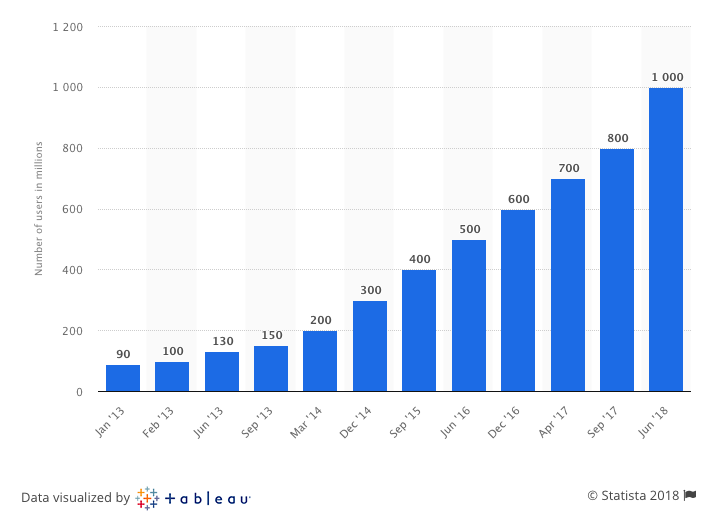 در ذیل جدول تعداد کاربران فعال اینستاگرام (به تفکیک ماهانه) را طی ژانویه ۲۰۱۳ تا ژوئن ۲۰۱۸ مشاهده می کنید. (ارقام به میلیون هستند.)