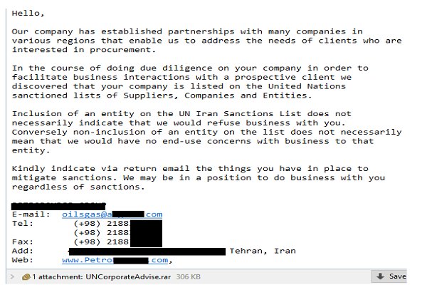 این ایمیل محتوایی مرتبط با موضوع تحریم ها داشته و پیوست همراه آن یک بدافزار جاسوسی در قالب یک فایل فشرده rar. با توانایی استخراج رمزهای عبور برنامههای مختلف ذخیره شده در سیستمهای عامل ویندوز قربانی است.