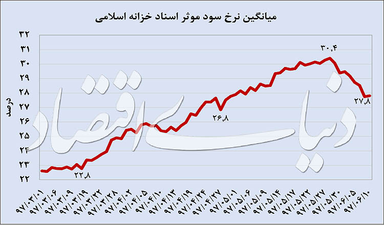 پس از یک دوره افزایشی و رسیدن نرخ سود اسناد خزانه اسلامی به بیش از ۳۰ درصد، از ابتدای شهریور شاهد تغییر این مسیر و ورود نرخ سود این اوراق به کانال ۲۷ درصدی هستیم.
