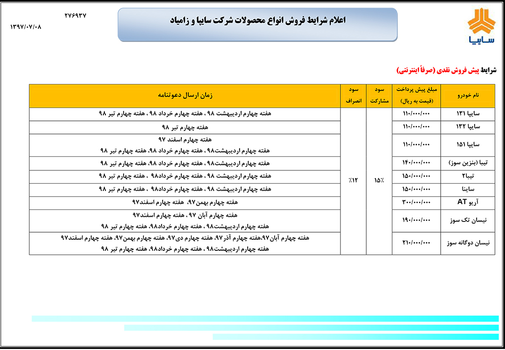 گروه خودروسازی سایپا به جهت تنظیم و مدیریت بازار و همچنین صیانت از حقوق مصرف کنندگان، پیش فروش جدید محصولات خود را از صبح روز سه شنبه ۹۷.۷.۱۰ به صورت اینترنتی آغاز و تا پایان تکمیل ظرفیت ادامه خواهد داشت.