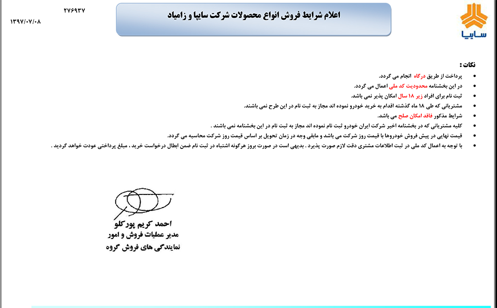بر اساس این خبر، سیاست گروه خودروسازی سایپا فروش خودرو به مصرف کننده نهایی است و لذا در این راستا و در فرایند ثبت نام اینترنتی، داشتن سن قانونی ۱۸ سال در زمان ثبت نام الزامی خواهد بود و خریداران بر اساس کد ملی ثبت نام خواهند شد و هر کد ملی می تواند یک محصول از گروه خودروسازی سایپا خریداری کند.