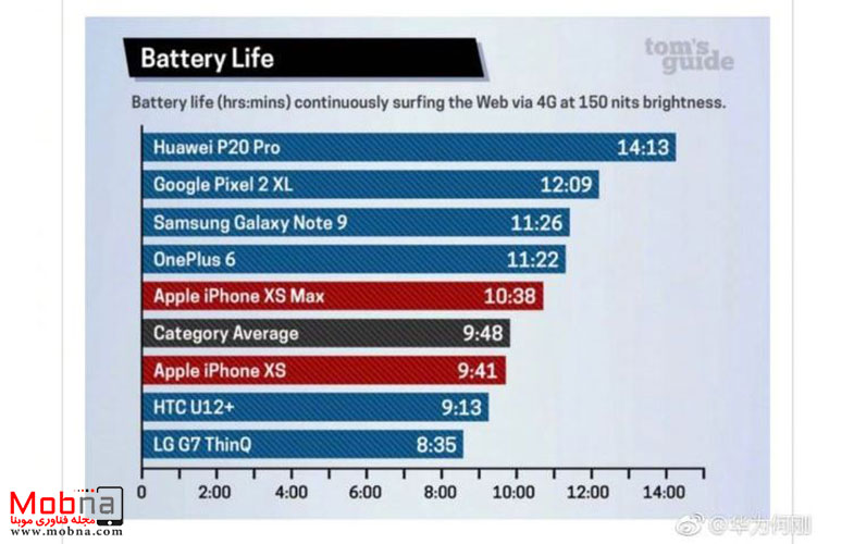 دوام باطری سامسونگ Note 9 با ۱۱ ساعت و ۲۶ دقیقه و plus 6 با ۱۱ ساعت و ۲۲ دقیقه ثبت شده و نکته قابل توجه این است که با وجود آنکه تنها مدت کوتاهی از رونمایی آیفون XS Max می‌گذرد، اما دوام باتری این گوشی با ۱۰ ساعت و ۳۸ دقیقه در سطح متوسط قرار گرفته و رکورد ضعیف ۹ ساعت و ۴۱ دقیقه نیز برای آیفون XS ثبت شده‌است.