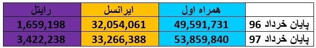 همانطور که در جدول به وضوح مشخص است، سیر توالی اپراتورها به ترتیب تعداد مشترکان فعال حفظ شده با این تفاوت که رایتل نسبت به مدت زمان حیات خود در حوزه ارتباطات، تنها ظرف سال گذشته توانسته حرکتی جهشی داشته باشد و با رشد ۱۰۶ درصدی تعداد مشترکان خود را به بیش از سه میلیون برساند.