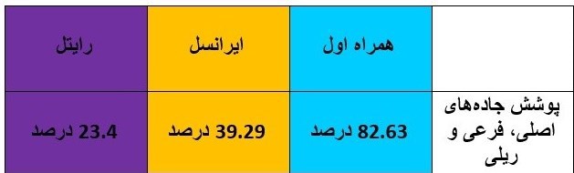 علاوه بر این میزان پوشش ارتباطات جادههای اصلی، فرعی و ریلی کشور تا پایان فصل نخست سال جاری به ۸۲.۶۴ درصد رسیده است؛ با توجه به اینکه گزارش بروزی از وضعیت اپراتورهای موبایل در این شاخص وجود ندارد در جدول زیر به میزان پوشش هر کدام از اپراتورهای اصلی کشور براساس آمار منتهی به پایان خرداد ماه سال گذشته میپردازیم.