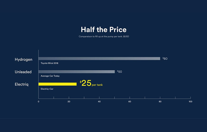 به عنوان مثال، در شرایطی که هزینه یک باک سوخت هیدروژنی ۸۰ دلار و هزینه یک باک بنزین بدون سرب ۵۰ دلار است، هزینه استفاده از این سوخت که electriq نام گرفته به تنها ۲۵دلار به ازای هر باک می رسد.
