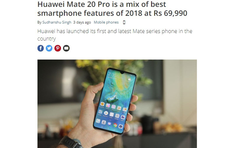 TechRadar در مقالهای Mate 20 Pro Huawei را «ترکیبی از بهترین ویژگیهای گوشیهای هوشمند سال 2018» نامید و بهطور ویژه از اولین شارژ بیسیم معکوس در جهان، عمر باتری عظیم، سختافزار متعهد و عملکرد عالی دوربین در نور کم این گوشی تمجید کرد.