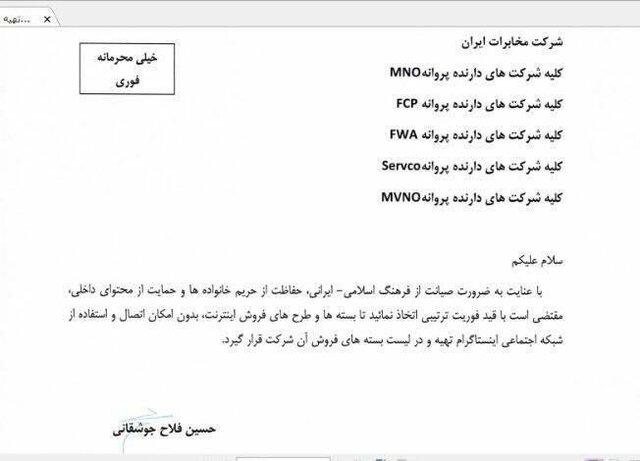 در این نامه ظاهرا از سوی سازمان تنظیم مقررات ارتباطات و رادیویی، خطاب به شرکت مخابرات ایران و کلیه شرکتهای ارایهکننده خدمات اینترنتی آمده است که با توجه به ضرورت صیانت از فرهنگ اسلامی ایرانی و حریم خانوادهها و حمایت از محتوای داخلی، با قید فوریت تصمیمی اتخاذ کنند که بستهها و طرحهای فروش اینترنت بدون امکان اتصال و استفاده از شبکه اجتماعی اینستاگرام، تهیه و در لیست بستههای فروش خود قرار دهند.