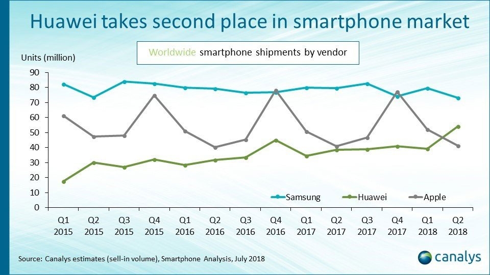 بر اساس گزارش منتشره از سوی Canalys هوآوی در فصل دوم 2018 توانست جایگاه اپل را به دست گرفته و دومین فروشنده گوشی در جهان شود.