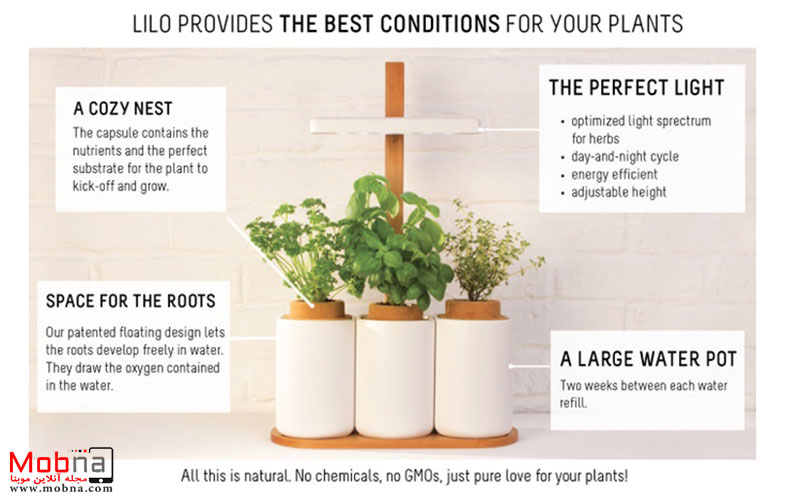 هر یک از این گیاهان داخل یک کپسول حاوی مواد مغذی مناسب برای گیاه بسته بندی شده اند. تنها کاری که باید انجام دهید وارد کردن کپسول های مورد علاقه تان در سه گلدان لیلو و افزودن آب به آنها است. طراحی شناور پتنتدار لیلو اجازه می دهد ریشه به طور آزادانه در آب رشد کند در شرایطی که سیستم روشنایی LED با قابلیت تنظیم ارتفاع طیف نوری مناسب برای گیاهان را فراهم می کند.