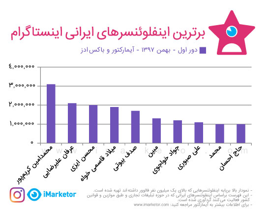 در ادامه قصد داریم لیست اینفلوئنسرهای ایرانی را که برای انجام تبلیغات توسط کسبوکارها یا برندها یا شرکت ها مناسبتر و موجهتر (عدم مغایرت واضح با قوانین و عرف تبلیغات در ایران) هستند بپردازیم. این فهرست به انتخاب آیمارکتور و براساس نوع محتوای قابل قبول برای مخاطبین برند تهیه شده است که مغایرتی با موازین وضع شده در کشور نداشته باشد.