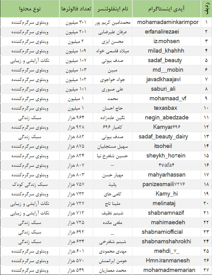 لیست زیر دربردارنده اسامی ماکرو اینفلوئنسرهای ایرانی است که بیش از ۵۰۰ هزار فالوئر دارند و برندهای معتبر نیز میتوانند برای معرفی بیشتر خود در فضای اینستاگرام با آنها همکاری کنند.