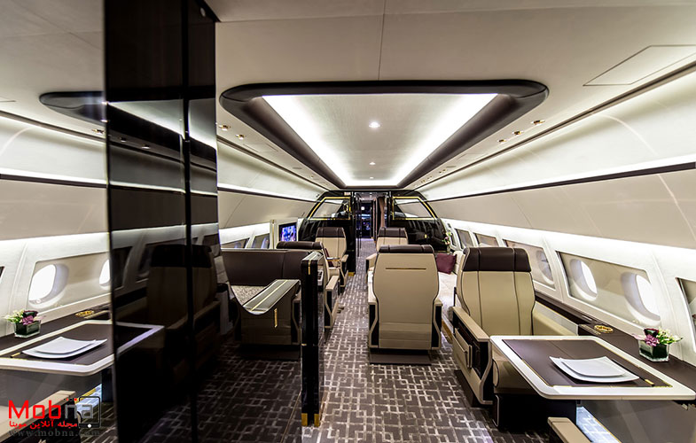 سالن اصلی این هواپیما دارای یک نشیمن جداگانه است که دو مسافر می توانند از نمایشگری صفحه عریض در آن استفاده کنند. اتاق خواب اصلی دارای حمامی مجهز به کابین دوش، فضای کار خصوصی، دو مبل و دو صندلی VIP که با یک میز کوچک از یکدیگر جدا شده اند، است.