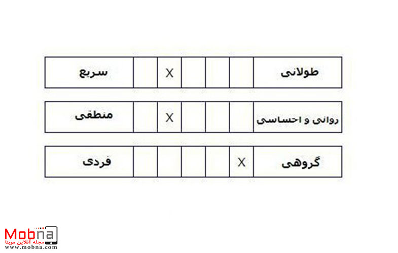 تصویر زیر ویژگی‌های روش تکه کاغذ کراوفورد را بر اساس سرعت، میزان وابستگی آن به منطق و همچنین تطابق با ایده پردازی به صورت گروهی و یا فردی را نشان می‌دهد.