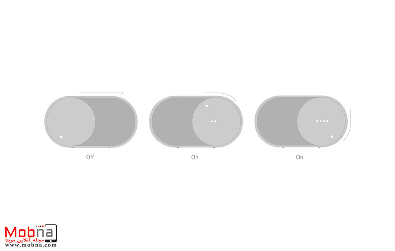 وضعیت روشن و خاموش شدن این اسپیکر نیز دقیقا شبیه حرکت دکمه در سیستمهای عامل موبایلی در نظر گرفتهشده که در تصاویر زیر مشاهده میکنید: