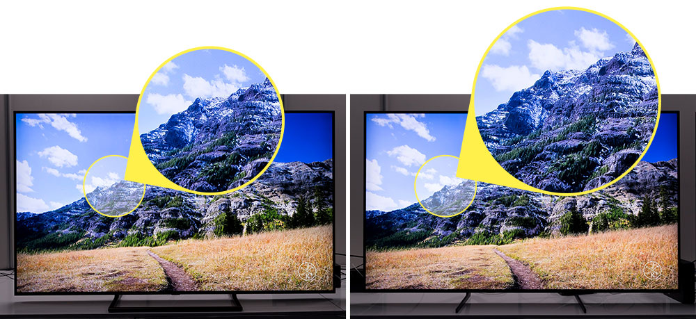 اما شرکت سامسونگ در سری QLED 4K و حتی 8K خود از یک فناوری نوآورانه به نام AI Upscaling استفاده می‎کند. تفاوت مهم در اینجا استفاده از هوش مصنوعی برای درک تصویر و پرکردن پیکسل‎های خالی متناسب با تصویر اصلی است. یعنی به جای آنکه از اطلاعات یک پیکسل برای پیکسل‎های مجاور استفاده شود، پیکسل‎های خالی بر اساس اطلاعات خود تصویر پر می‎شوند. یعنی یک تصویر 4K یا 8K واقعی برای شما ساخته می‎شود.